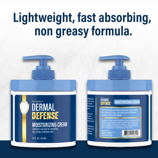 Dermal Defense Moisturizing Cream is a pediatrician-developed solution for sensitive, dry, and eczema-prone skin. This fragrance-free formula offers fast-absorbing, long-lasting hydration that soothes irritation, itching, and redness without leaving a greasy feel. Whether you’re dealing with chronic eczema, occasional flare-ups, or seasonal dryness, this cream helps restore your skin’s protective barrier while providing the hydration your skin is likely lacking. Perfect for adults, children, and anyone seeking a gentle, effective, hypoallergenic cream.